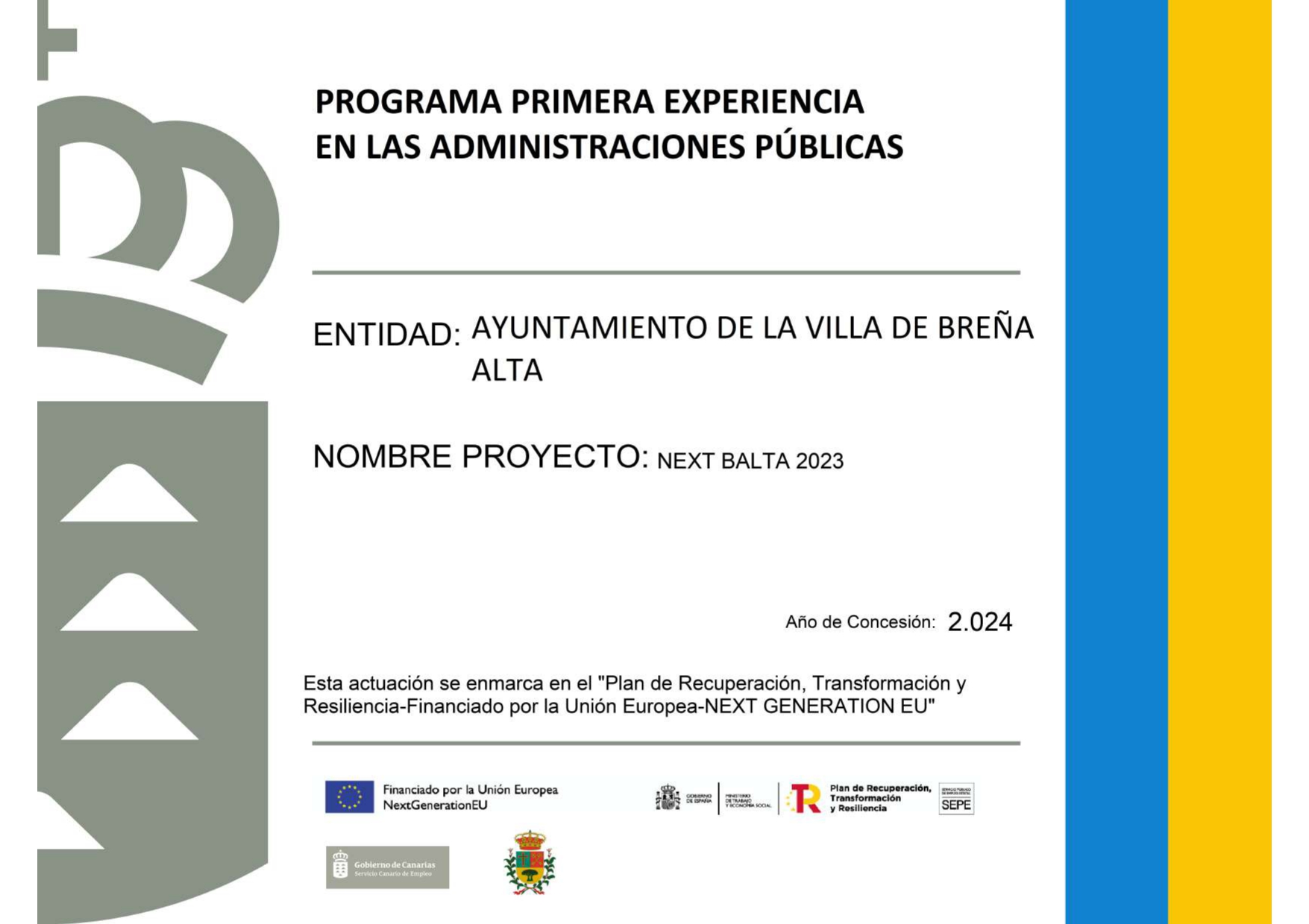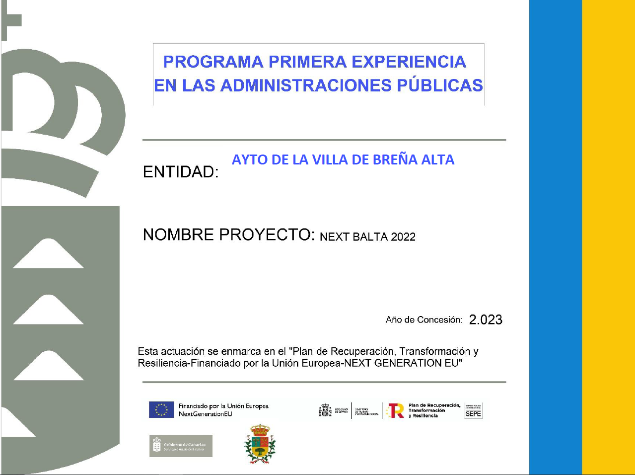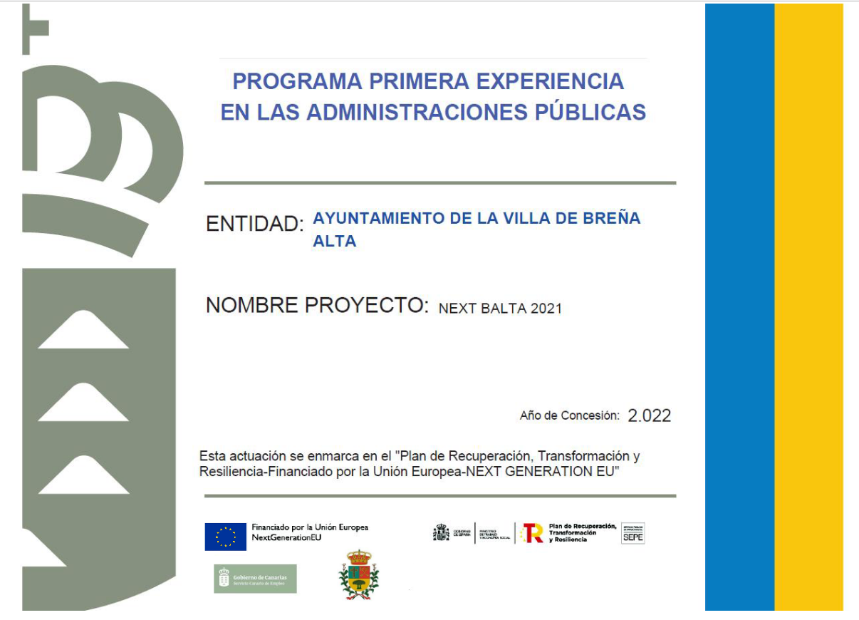 Al Ayuntamiento de la Villa de Breña Alta le fue concedida una subvención por importe de ciento veintiocho mil cuatrocientos treinta y cinco euros con cincuenta y dos céntimos (128.435,52 EUR.), destinada a la financiación de los costes laborales de las personas jóvenes trabajadoras contratadas para la realización del Proyecto denominado "NEXT BALTA 2021", en la modalidad de contrato formativo para la obtención de la práctica profesional.
